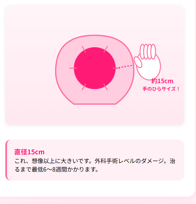 胎盤が剥がれた後の子宮内壁には、手のひら大の傷ができています。これは外科手術で作られる傷と同等、あるいはそれ以上のダメージです。この傷が完全に治癒するまでには、最低でも6〜8週間かかります。