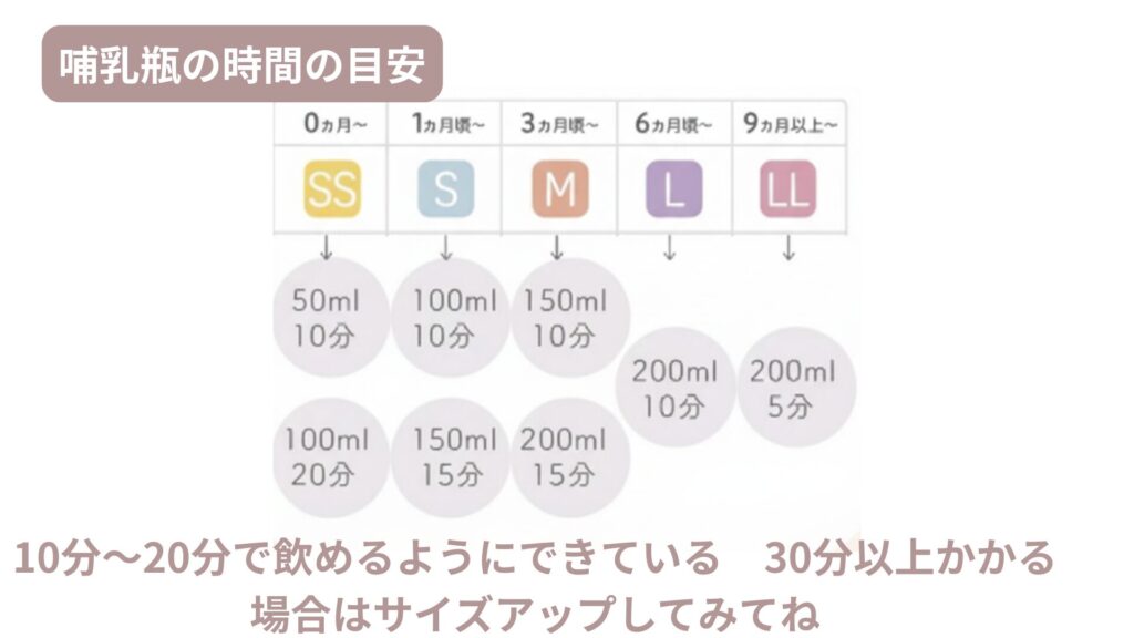 | M | 3ヶ月〜 | 150ml / 10分 | 首がすわり、飲む力が安定してくる時期 |